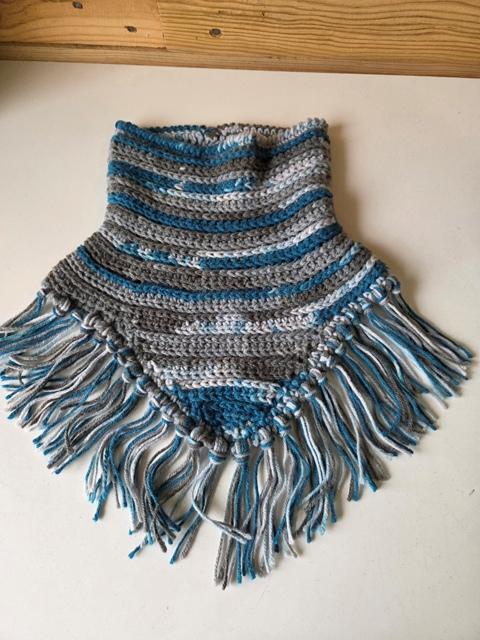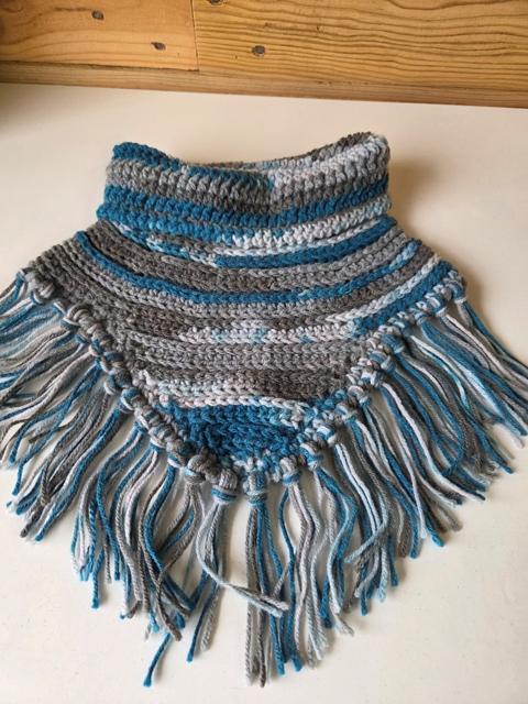Con vuelta en el cuello y pico delantero con flecos